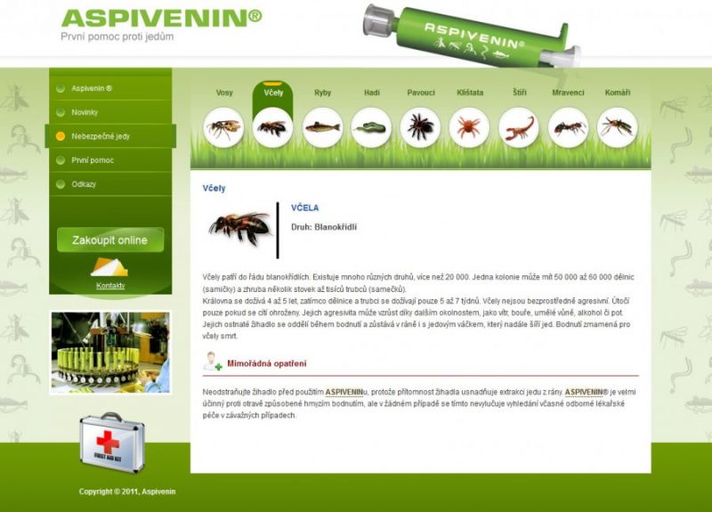 Přehledná prezentace produktu Aspivenin a zároveň možnost koupě produktu (jednoduchý eshop).