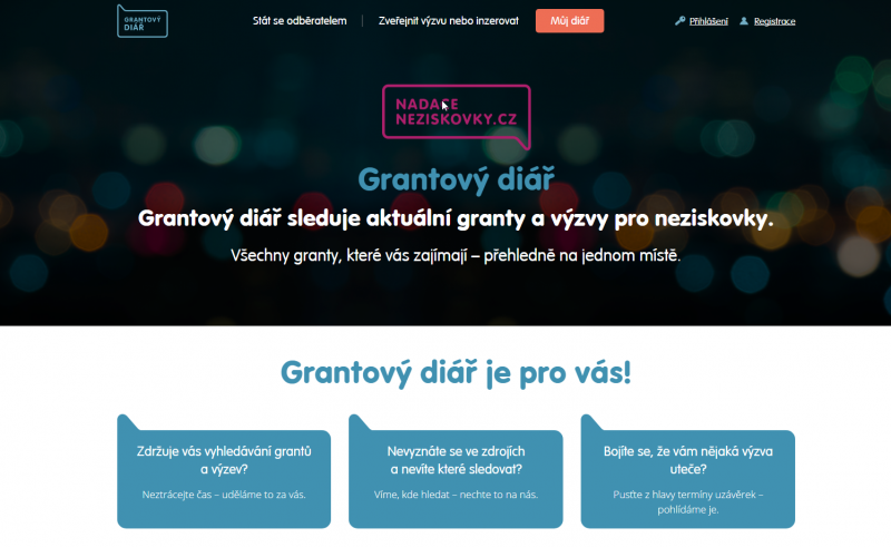 Vytvoření prezentace grantového diáře, který sleduje aktuální granty a výzvy pro neziskovky. Web splňuje trend současné doby - moderní současnou grafiku, optimalizaci pro mobilní zařízení (responsivní design) a je spravován pomocí CMS. Systém je postaven na Nette).Ve spolupráci s firmou ANDWEB s.r.o. Mojí prací bylo kódování šablon + responsivní design, programování dynamických modulů (backend, frontend).
